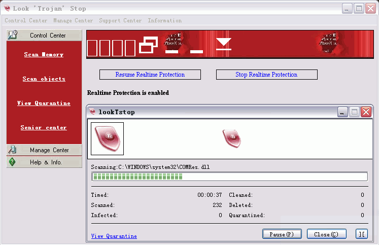 With a few easy steps Look 'Trojan' Stop will scan and remove trojan horses, viruses, and spyware from your PC. Virus definition update and automatic update supported. The advanced harmful-websites detection technology can block most web-viruses and script-viruses. The scheduled scan supports automatic scan at specified time.